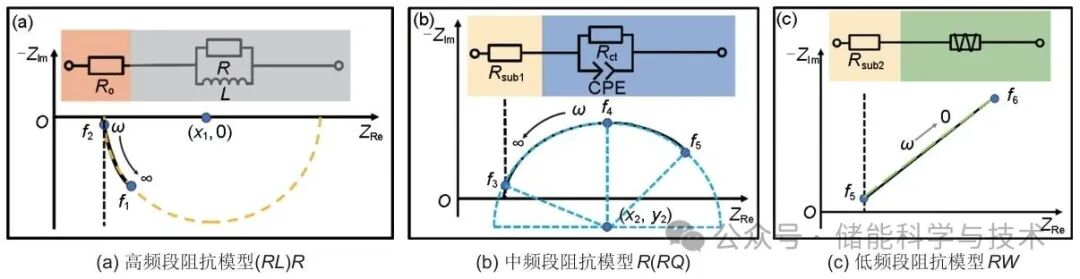 高频感抗阶段与LIBs本身无关,不提供有关电池电化学状态的有价值信息,通常对该阶段的数据进行裁剪,但基于该段EIS可辨识出阻抗谱与实轴的交点,即欧姆内阻Ro,构建如图3(a)所示的高频段阻抗模型(RL)R,阻抗表达式如下:
