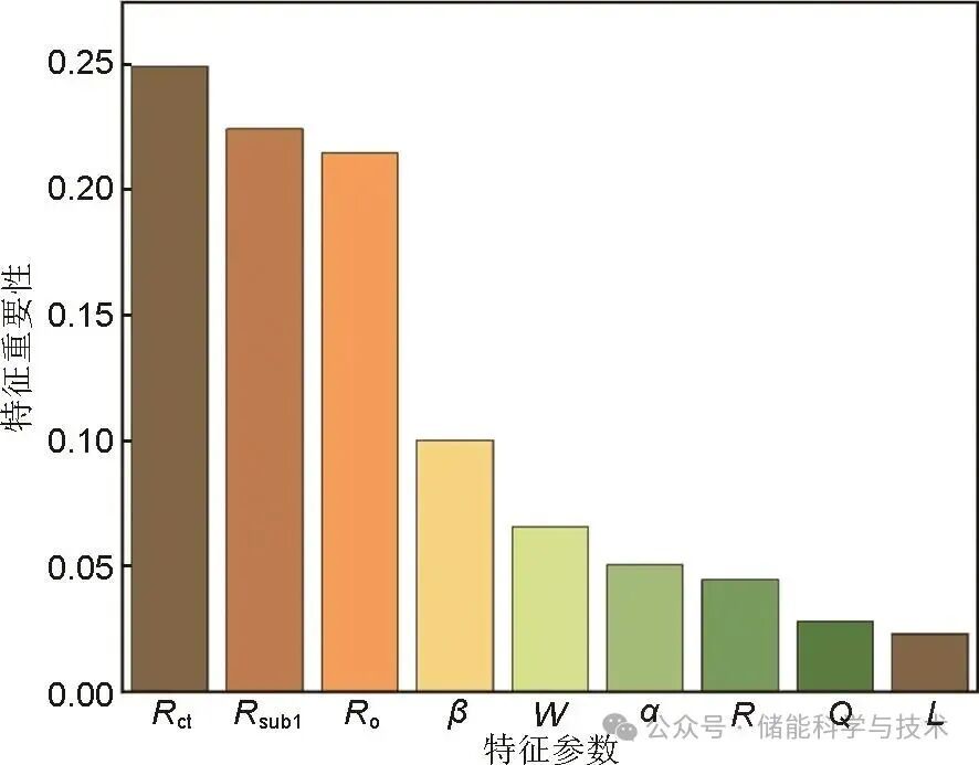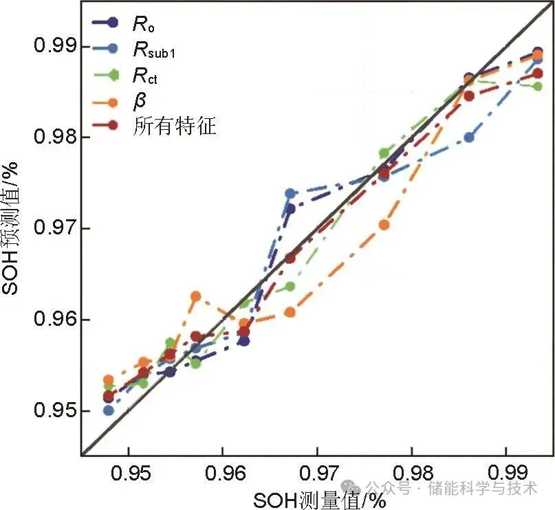 通过特征重要性评估量化各EIS特征对SOH评估的贡献度,如图8所示,特征参数Rct、Ro、Rsub1、β均大于0.1,因此这4个特征参数为强相关特征。Ro、Rsub1和Rct、β为基于高频段、中频段、低频段EIS获得的特征参数,由于Ro、Rsub1、Rct随着电池老化而变大,扩散阶段的斜线斜率(变化趋势与β等同)会随着电池老化呈现减小的趋势,因此重要性评估结果符合一般性规律。