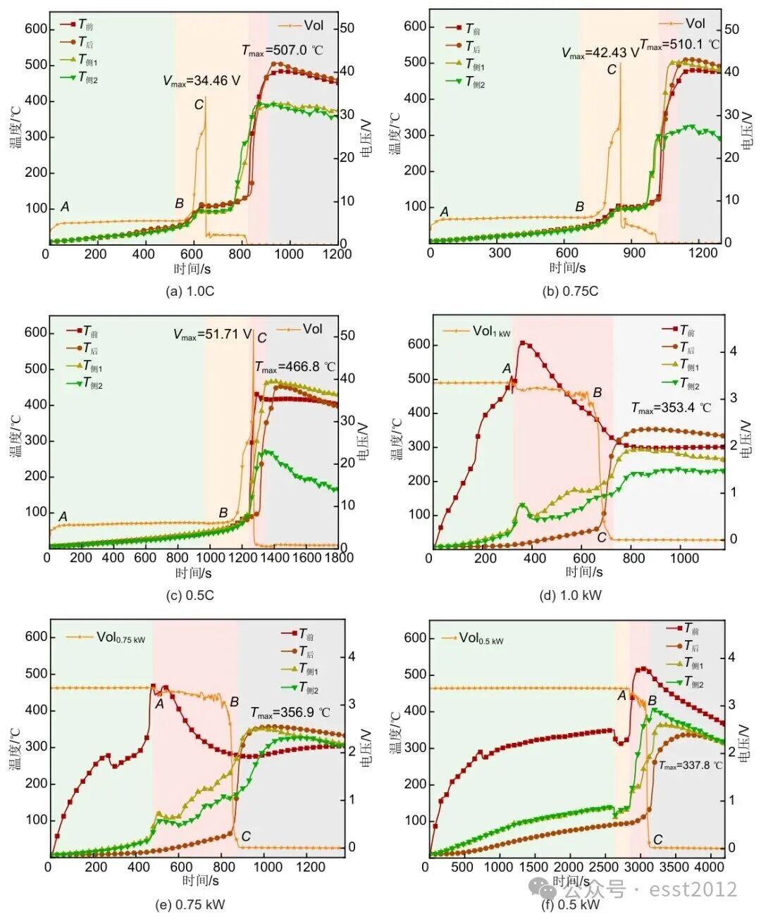 图2(d)~(f)展示了在不同加热功率(1.0 kW、0.75 kW、0.5 kW)下的热失控行为差异。尽管阶段划分与过充实验相似(加热阶段→安全阀排气→热失控→衰退),但存在关键区别。