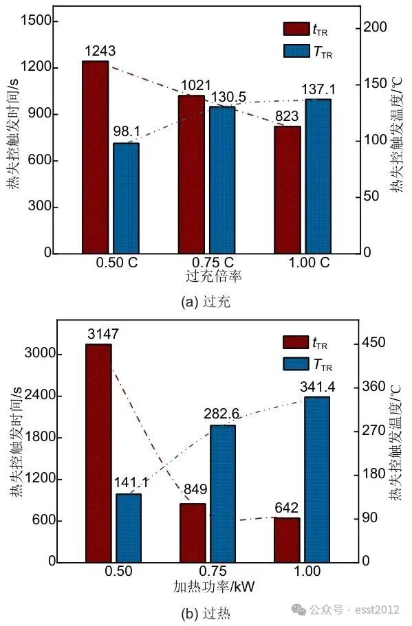 进一步分析,图4(a)呈现了不同过充倍率下磷酸铁锂电池热失控触发时间及对应的温度值。图4(b)展示了在不同加热功率条件下电池热失控触发时间及对应的温度值。此处热失控触发以背面远离加热板的表面温升速率变化为判断依据。可以清晰地看出,随着过充倍率的递增和加热功率不断增大,电池的热失控触发时间逐步缩短,而热失控触发时刻电池温度呈增大态势。