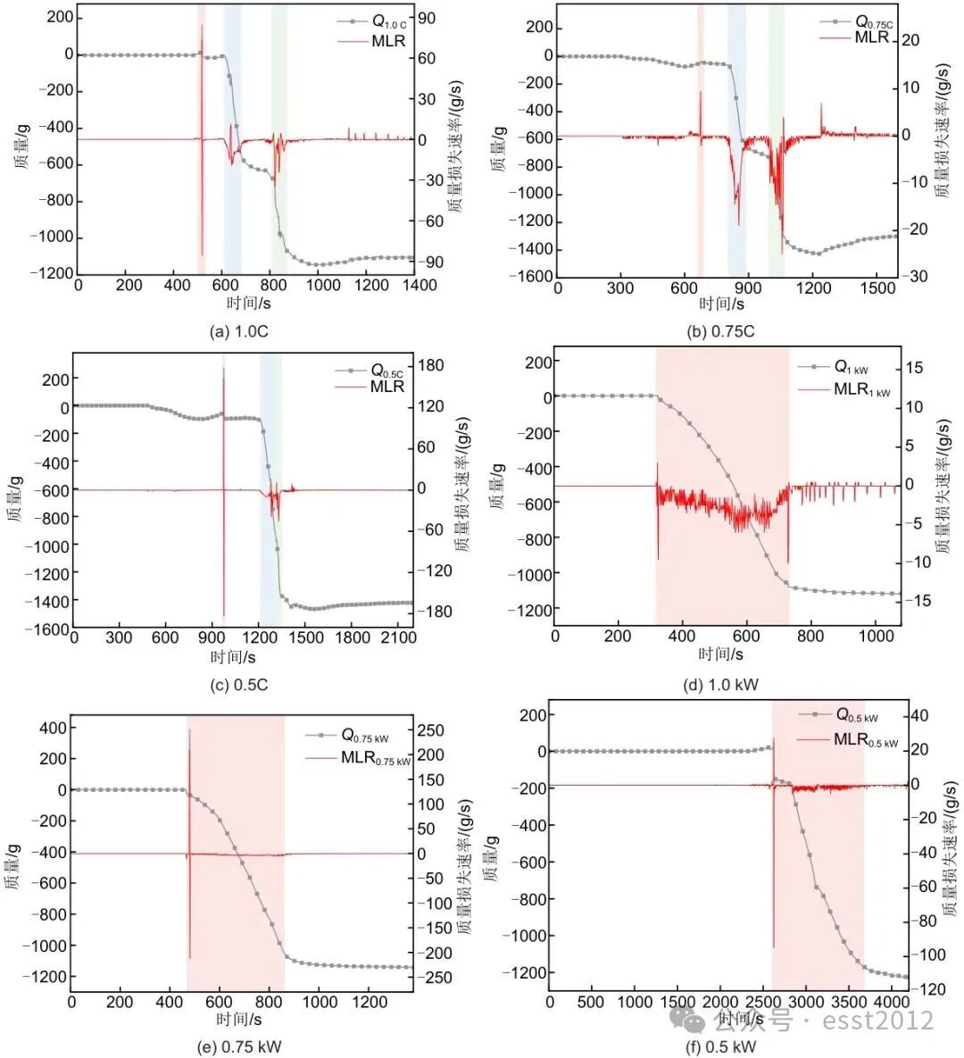 值得注意的是,结合图3,无论在过充或过热条件下,纵观热失控质量损失的全过程,电池表面温度的变化呈现出明显的阶段性特征。具体而言,在质量损失的前期与中期阶段,电池表面温度的增幅较为平缓,未见剧烈攀升态势;直至质量损失进入后期,电池表面温度才陡然急剧上升。这表明,在电池热失控的起始阶段,电池内部所产生的热量大多聚集于生成的烟气之内。此时,热量主要以热失控烟气为媒介,向周围环境散发,从而使得电池主体的温度变化并不显著。直至热失控后期烟气生成速率减缓,内部热量因难以快速通过烟气向外疏散,进而开始在电池内部积累,电池表面温度才会出现明显的攀升态势。